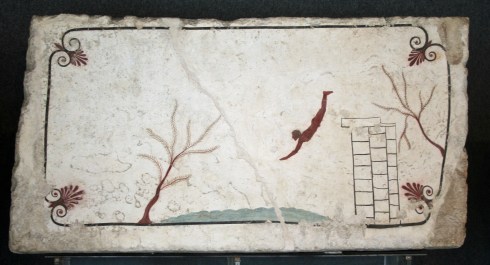 It worked and the museum was really cool. One of the treasures was a set of tomb paintings. Of these, the most famous and studied is called the “Tomb of the Diver.” It represents the voyage between this life and the next life. It was really cool. See it below.