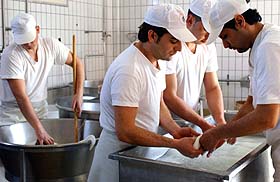 We also saw the workers form the mozzarella from the “dough.” It’s pretty amazing, actually. To get those small balls of mozzarella we’re used to, the workers pinch off pieces from the dough which is over 150 degrees as they handle it. Talk about tough. As Americans, we often eat mozzarella incorrectly. When eaten properly, mozzarella is served at room temperature and it should be bought in 1 kilogram pieces at a minimum. Of course, our guide added, many people prefer the small balls of mozzarella, but those are not traditional.