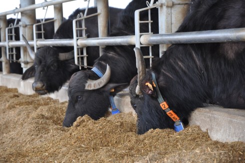 The buffalo have the five-star hotel treatment (for buffalo). Their stables are divided into two sections. In the front, there’s bountiful food. When they want water, they simply pass through a door to get to the back. Upon returning, however, they must be milked. There is a waiting area as they prepare to be milked, where there are scratching posts and mats for napping. Then, they enter the robotic milking area. A computerized system collects the milk from them and stores information on how much milk comes from each tete, allowing the farmers to track milk production over time.