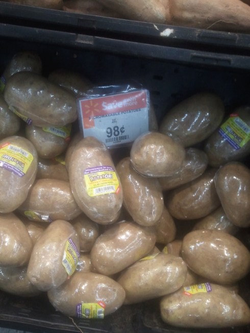 It’s official. The world is ending. About a week ago, I told you about the newest in silly ways to pollute the earth: plastic wrapped bananas. Well, sadly you can now own an unnecessarily-wrapped-in-plastic vegetable to go along with your banana. That’s right. Introducing potatoes coated in plastic. They were spotted in Walmart.