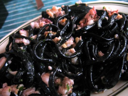The group was split into two because they couldn’t fit all 14 of us at one table, in spite of the fact that the restaurant was empty. The menu offered a wonderful collection of odd dishes. Some of the kids were brave enough to try some of them. One of the most adventurous, which I had previously tried, was squid ink pasta. The pasta includes some of that black ink from squid that fishermen bring into their nets.