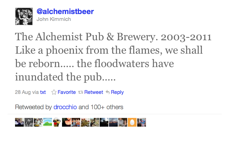 2. The Alchemist Pub & Brewery: On Sunday evening, August 28, a devastating “once in a generation flood” swept through Waterbury, VT and “ruined” The Alchemist Pub. The pub announced the tragic news on Twitter: