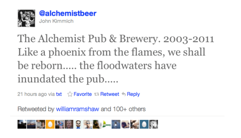 2. The Alchemist Pub & Brewery: On Sunday evening, August 28, a devastating “once in a generation flood” swept through Waterbury, VT and “ruined” The Alchemist Pub. The pub announced the tragic news on Twitter: